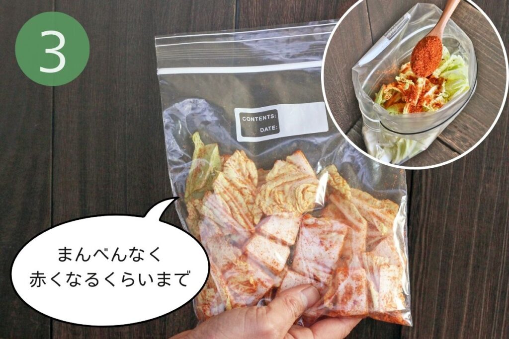 「キムチの素」をふりかけて揉む。