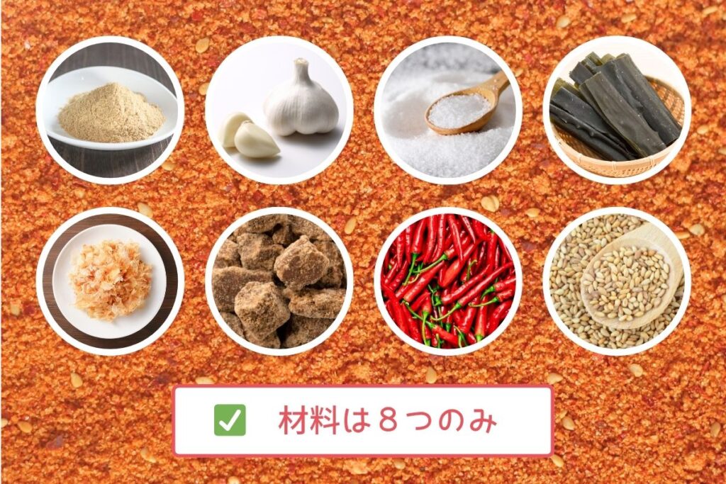 にんにく・塩・昆布・鰹・黒糖・唐辛子・ごまを